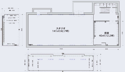 | 間取り | スタジオ(141m²/ 約8×16×H4.2m) 前室40m2/約6×6×H4.2m キッチン トイレ(男1、女2) |